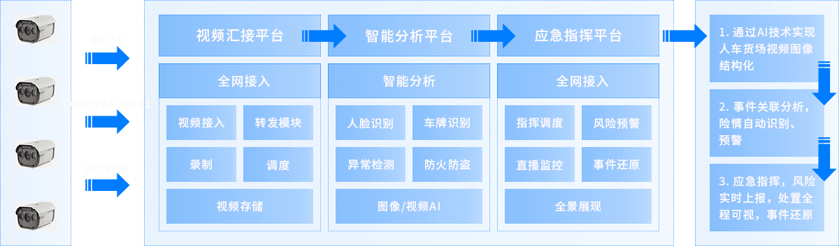结合智慧交通、智慧物流园区视频分析应用场景,视频汇接对各种形式的视频图像资源,存储,分发,上云;智能分析利用视觉智能技术,对视频图像结构化处理, 实现人车设备位置等物流要素数字化,识别险情和异常行为。应急指挥对视频分析险情和异常行为全网监控,接收实时报警,集中调度指挥,现场处置可视化,事后还原事件。