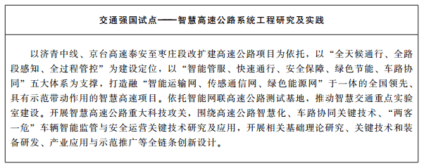2.建设两个智慧化试点工程。按照新基建部署要求,推 进交通运输信息化向数字化、网络化、智能化发展,推动 “交通链”向“数据链”转变。加快以智能设施、车路协 同、船岸协同等技术为特征的“智慧高速”“智慧港口” 两个试点工程建设。开展交通强国“智慧高速公路系统工 程研究及实践”试点,实施济青中线、京台高速泰安至枣 庄段智慧高速公路项目,在路网感知、车路协同、信息化 管服等方面实现新突破;利用滨莱高速原址保留路段,打 造全国首个面向无人驾驶的智能网联高速公路封闭测试基 地。完善国家干线公路视频监测网络,深化电子不停车收 费系统(ETC)门架应用,推进高精度数字化基础设施地图 和交通基础设施信息库建设,实现视频、气象、事件检测 等信息云上汇聚、全省网联。开展交通强国智慧港口试 点,实施自动化集装箱码头、传统码头智能化改造工程和 智慧港口信息化建设,打造世界领先的新一代智慧港口。