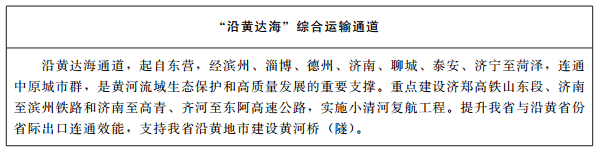 (一)完善“一轴两廊十通道”综合运输大通道。遵循 《国家综合立体交通网规划纲要》“一轴两廊”(京津冀 —长三角主轴、京哈走廊和京藏走廊)和《黄河流域生态 保护和高质量发展规划纲要》“一字型”沿黄通道山东布 局,在巩固提升既有“四横五纵”综合运输通道的基础 上,推动形成“四横五纵沿黄达海”十大通道。