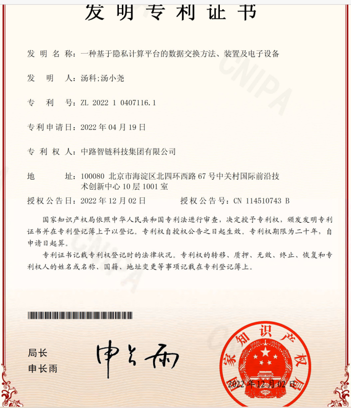 中路智链科技集团有限公司隐私计算技术团队自主研发的“一种基于隐私计算平台的数据交换方法、装置及电子设备”于2022年12月02日获中华人民共和国国家知识产权局授予发明专利授权,专利号:ZL 2022 1 0407116 .1。这是公司创立以来在隐私计算领域获得的第一项发明专利,也是公司获得的第八项专利。