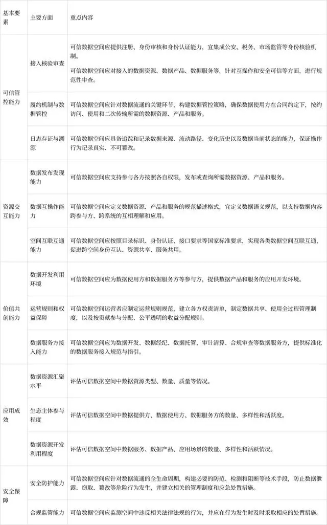 1.可信数据空间。可信数据空间是基于共识规则,联接多方主体,实现数据资源共享共用的一种数据流通利用基础设施,是数据要素价值共创的应用生态,是支撑构建全国一体化数据市场的重要载体。可信数据空间须具备数据可信管控、资源交互、价值共创三类核心能力。本文件所称可信数据空间、数据空间、空间的含义相同。