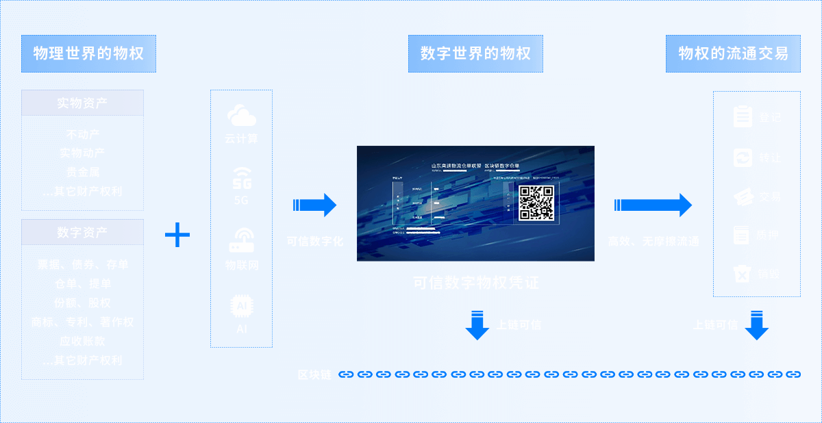 数字物权平台是以“区块链仓单”、“可信票据凭证”等各类型权利凭证为载体形成全套的可信资产体系,平台融合区块链、物联网及人工智能等最新技术对实物资产进行锚定,通过科技赋能和系统对接将传统商品流通转化为安全可靠、资产穿透至底层并且具备良好流动性的数字资产,开展基于仓储物等各品类物权及债权的交易及金融服务业务。