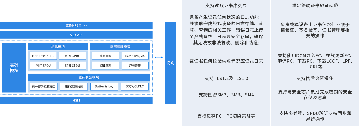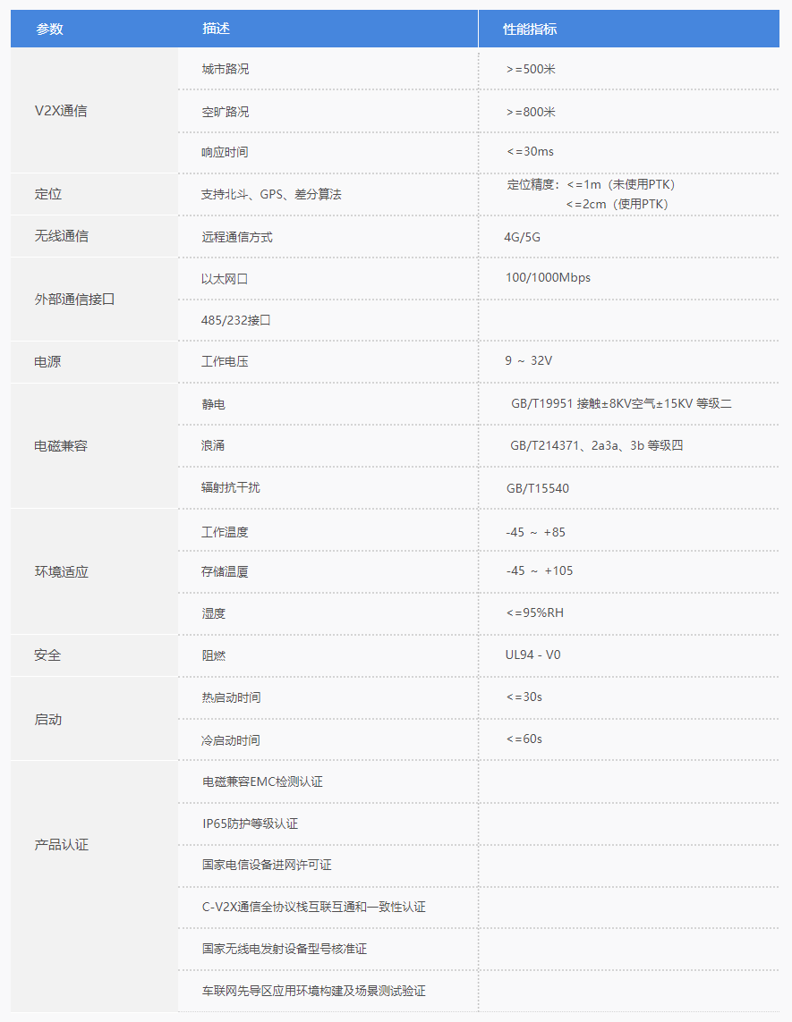 湿度 <=95%RH 阻燃 UL94 - V0 热启动时间 <=30s 冷启动时间 <=60s 电磁兼容EMC检测认证 IP65防护等级认证 国家电信设备进网许可证 C-V2X通信全协议栈互联互通和一致性认证 国家无线电发射设备型号核准证 车联网先导区应用环境构建及场景测试验证