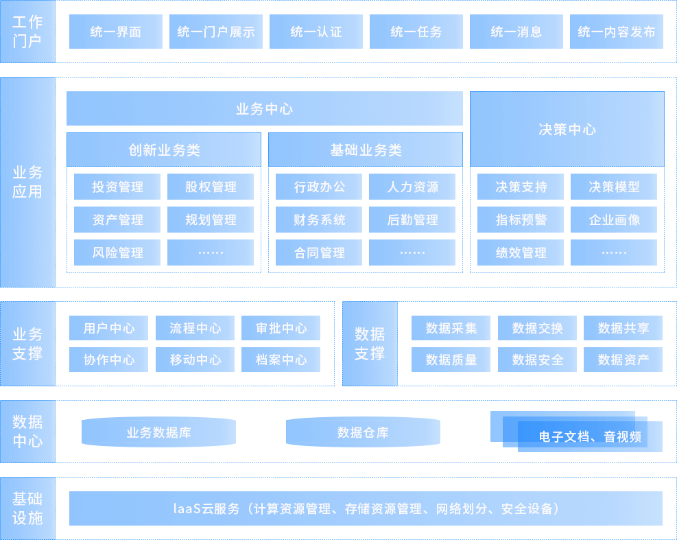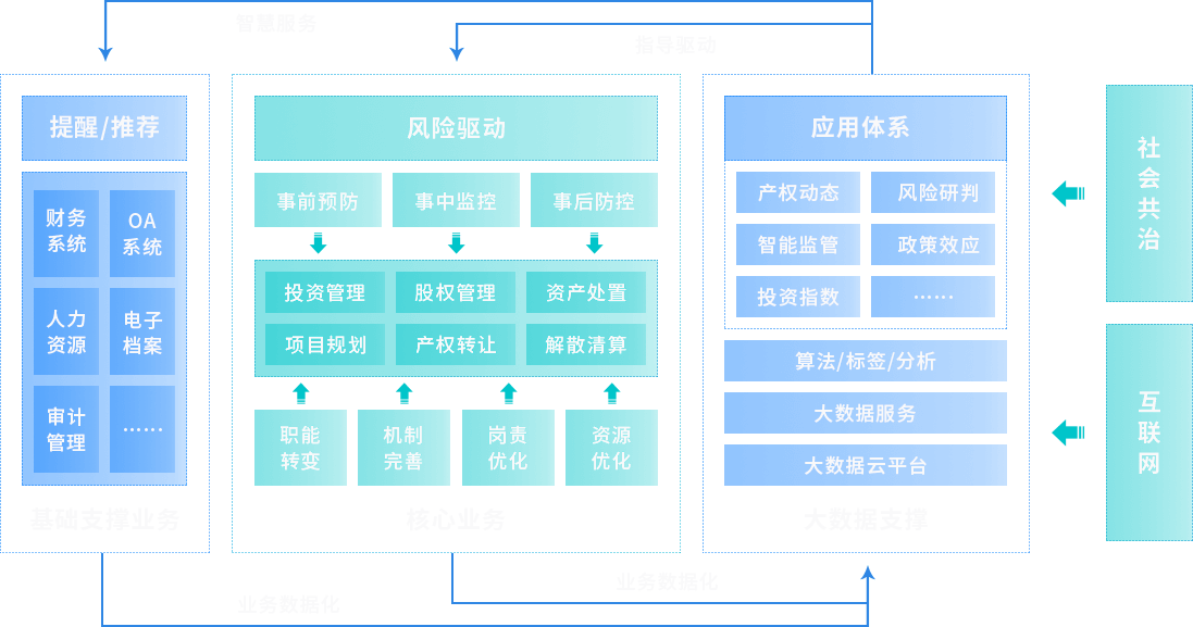 面对当今经济大环境、全球疫情等诸多不确定因素的影响,所有国有资本运营企业都面临着同样数字化转型的挑战,既企业内部各部门之间相对独立,系统数据综合分析难、数据质量差、数据各自保存、数据间缺乏关联性、数据库彼此无法兼容等问题导致了集团中大量有价值的数据无法有效利用。借助云计算、大数据、人工智能等技术手段,基于算法、标签、分析的实效,形成风险控制与服务提醒,以风险驱动提升权属企业监管质效,一切业务数字化,一切数字业务化,最大化满足国有资产保值、增值诉求,打造DT时代的国有资本运营业务模式。